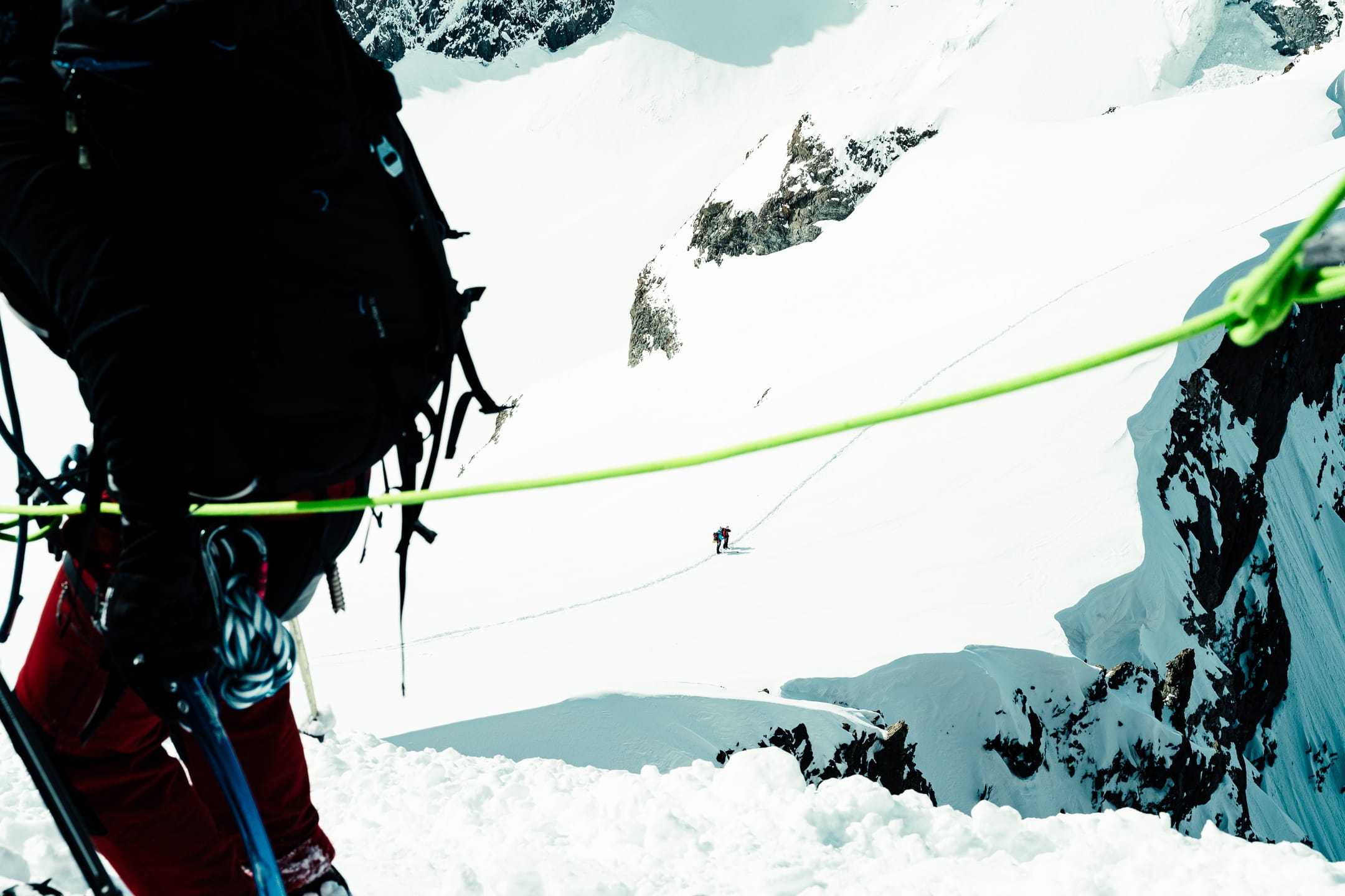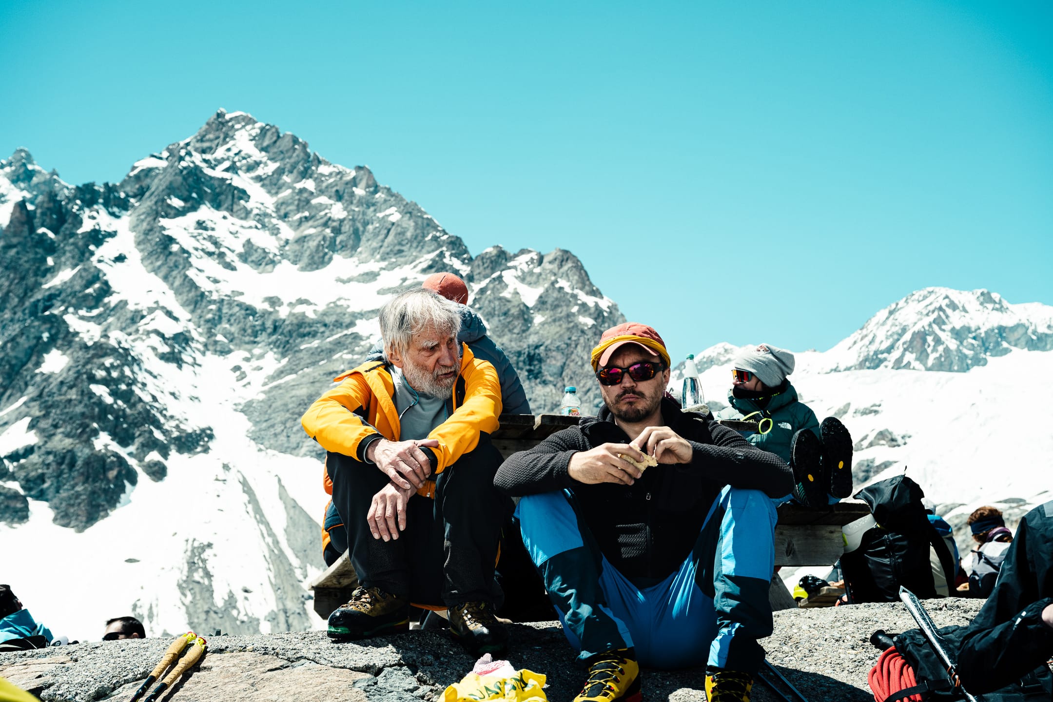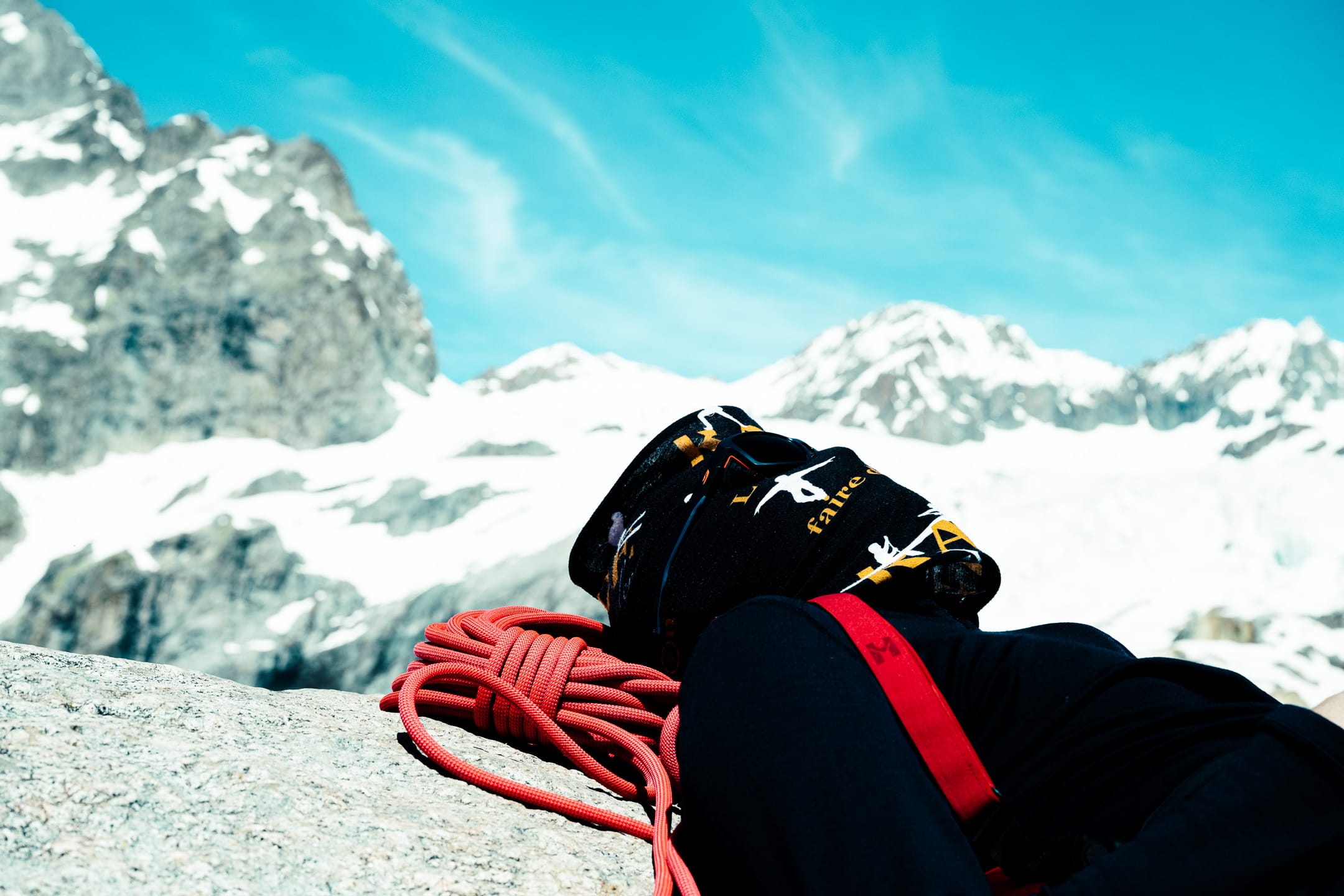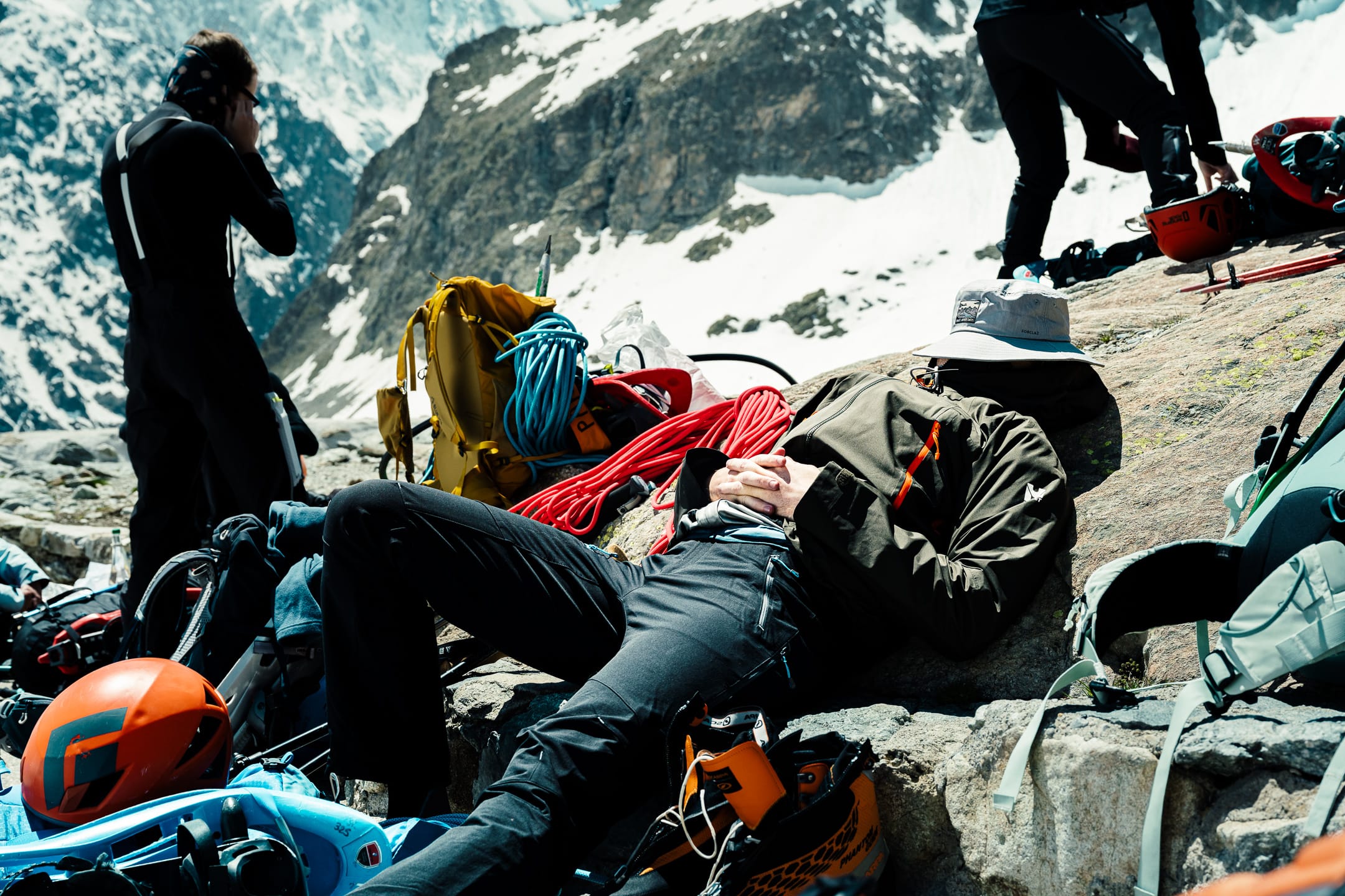 Réaliser des photos ici est un certain défi sur différents points. Niveau matériel, il faut quelque chose de léger et de réactif. J’ai mon boîtier Nikon Z7II avec un 24-70 mm f/2.8 ; trois batteries : c’est déjà lourd. Pour le ranger dans le sac d’alpinisme, j’utilise une housse. Je le laisse toutefois accroché à la bretelle du sac à dos, avec une attache rapide, afin de pouvoir faire mes prises de vue au plus vite. Malgré le peu de matériel, le dénivelé m’a rappelé l’expression de « caillou » pour discuter équipement photo. Oui, j’ai l’impression d’avoir lesté le sac. Je suis le seul avec du matériel photographique conséquent, en plus des essentiels d’alpinisme que nous avons chacun·e : je ne regrette pas de travailler le cardio pour ne pas être à la traîne.