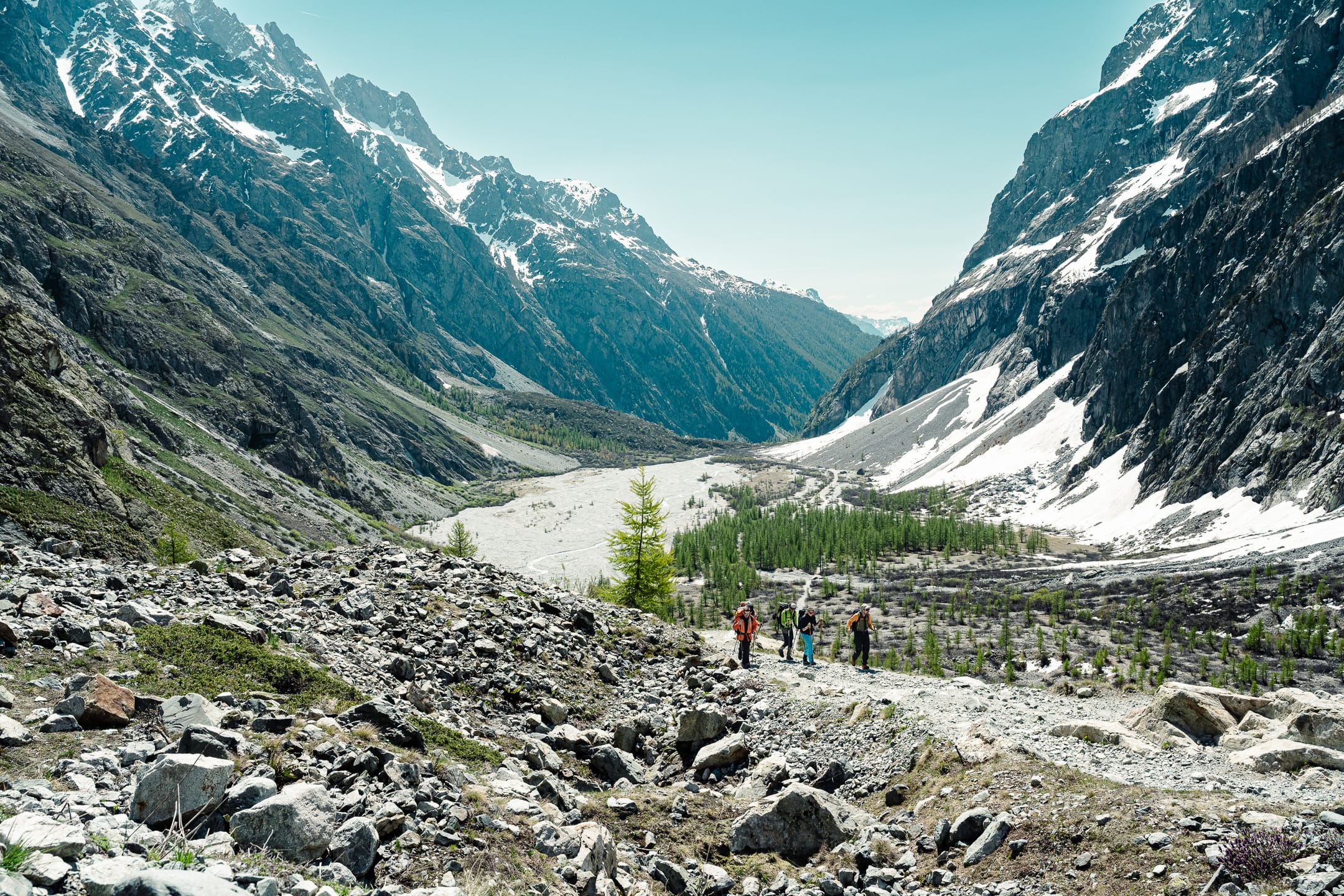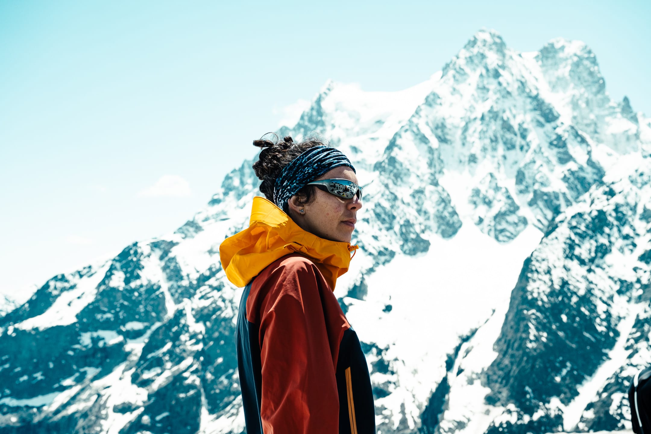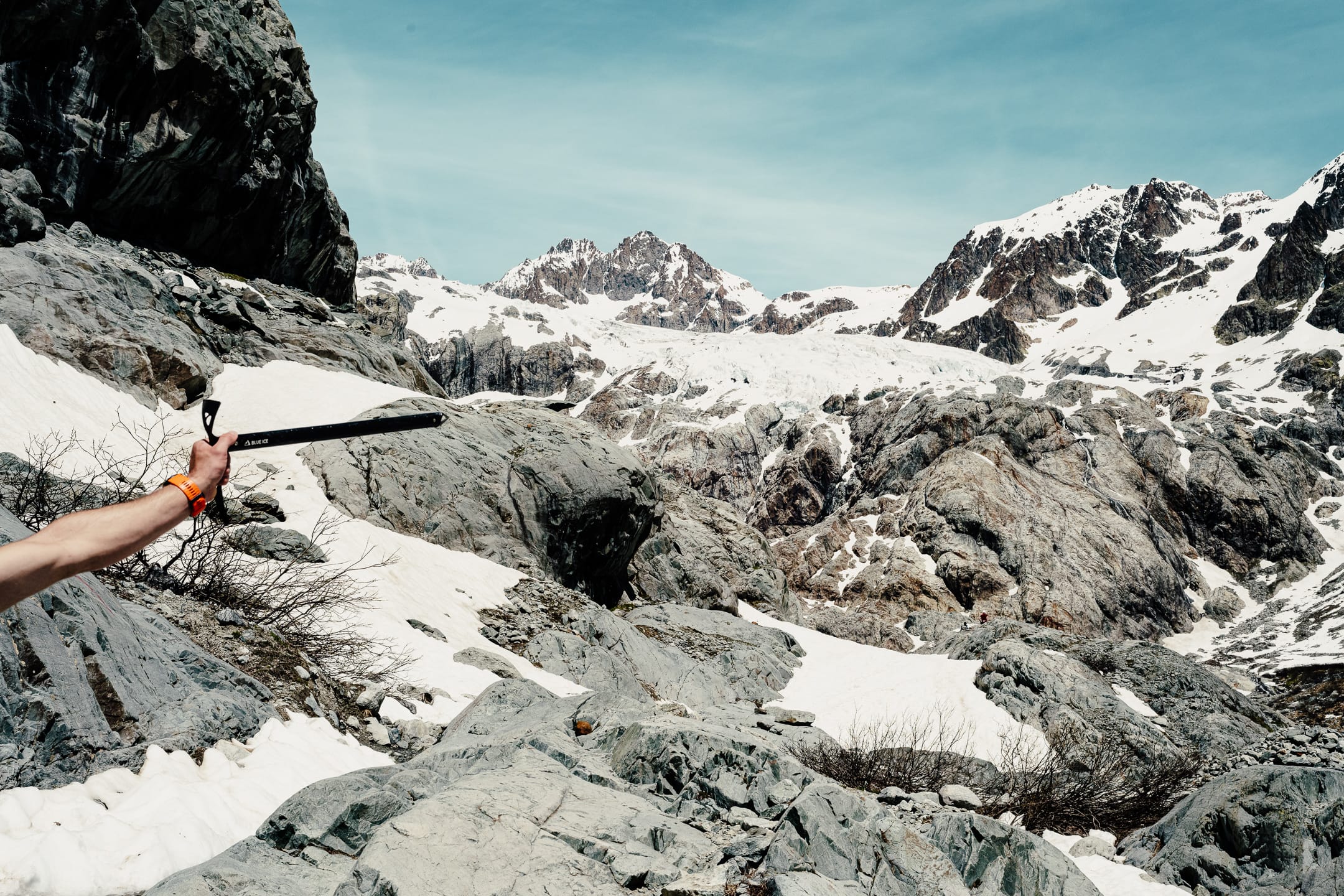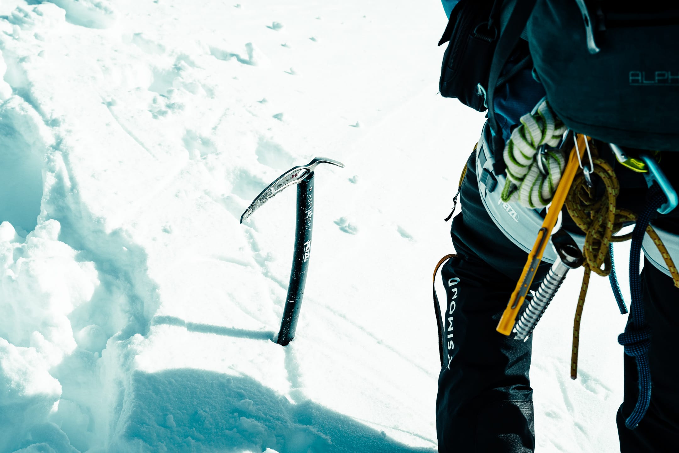 Réaliser des photos ici est un certain défi sur différents points. Niveau matériel, il faut quelque chose de léger et de réactif. J’ai mon boîtier Nikon Z7II avec un 24-70 mm f/2.8 ; trois batteries : c’est déjà lourd. Pour le ranger dans le sac d’alpinisme, j’utilise une housse. Je le laisse toutefois accroché à la bretelle du sac à dos, avec une attache rapide, afin de pouvoir faire mes prises de vue au plus vite. Malgré le peu de matériel, le dénivelé m’a rappelé l’expression de « caillou » pour discuter équipement photo. Oui, j’ai l’impression d’avoir lesté le sac. Je suis le seul avec du matériel photographique conséquent, en plus des essentiels d’alpinisme que nous avons chacun·e : je ne regrette pas de travailler le cardio pour ne pas être à la traîne.