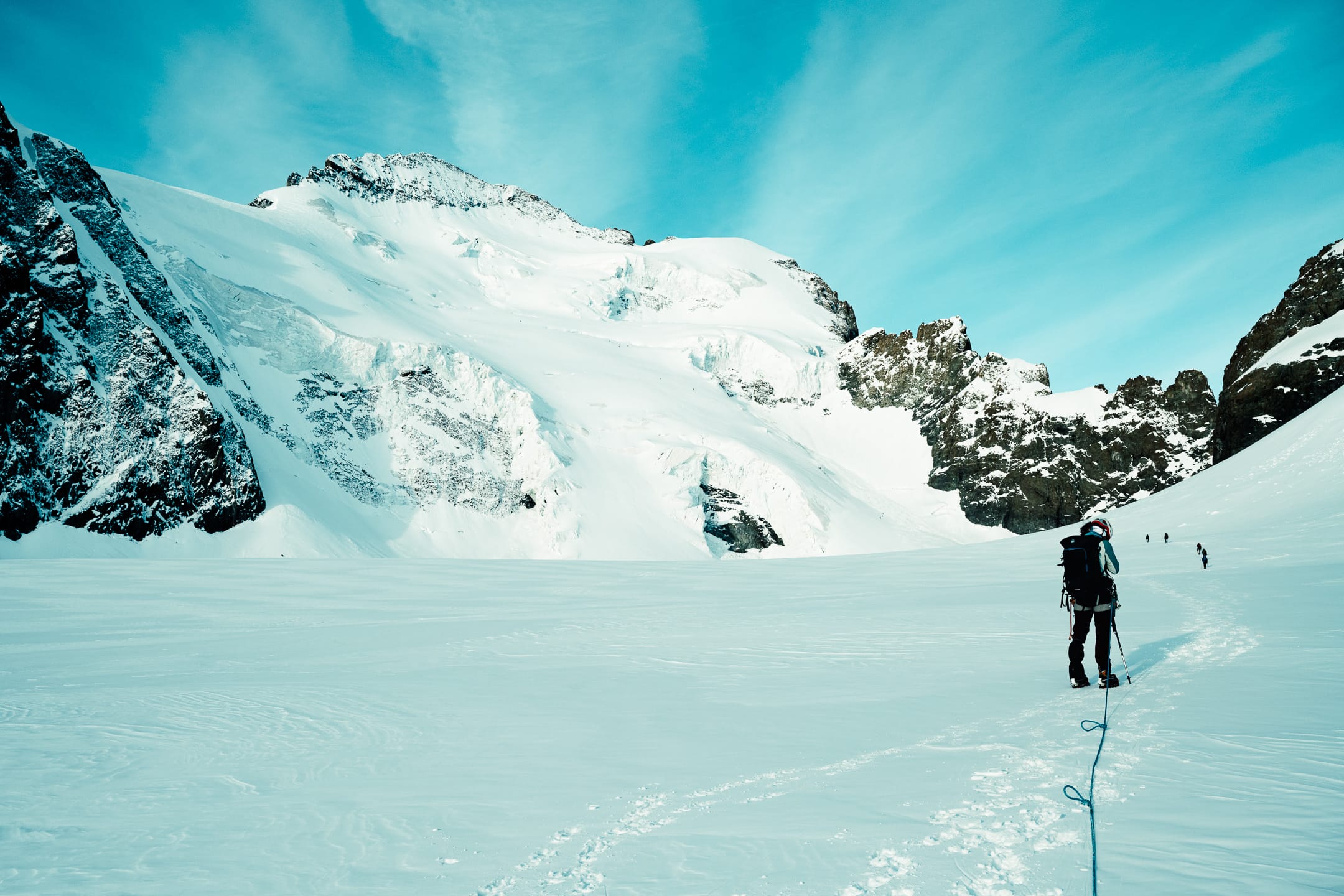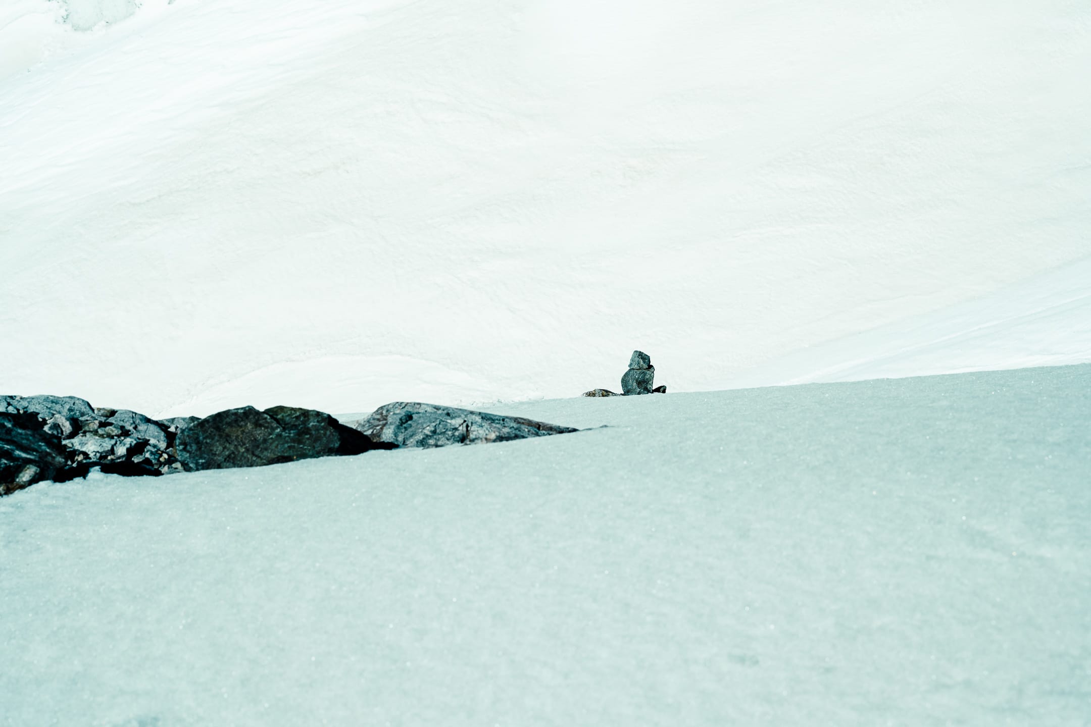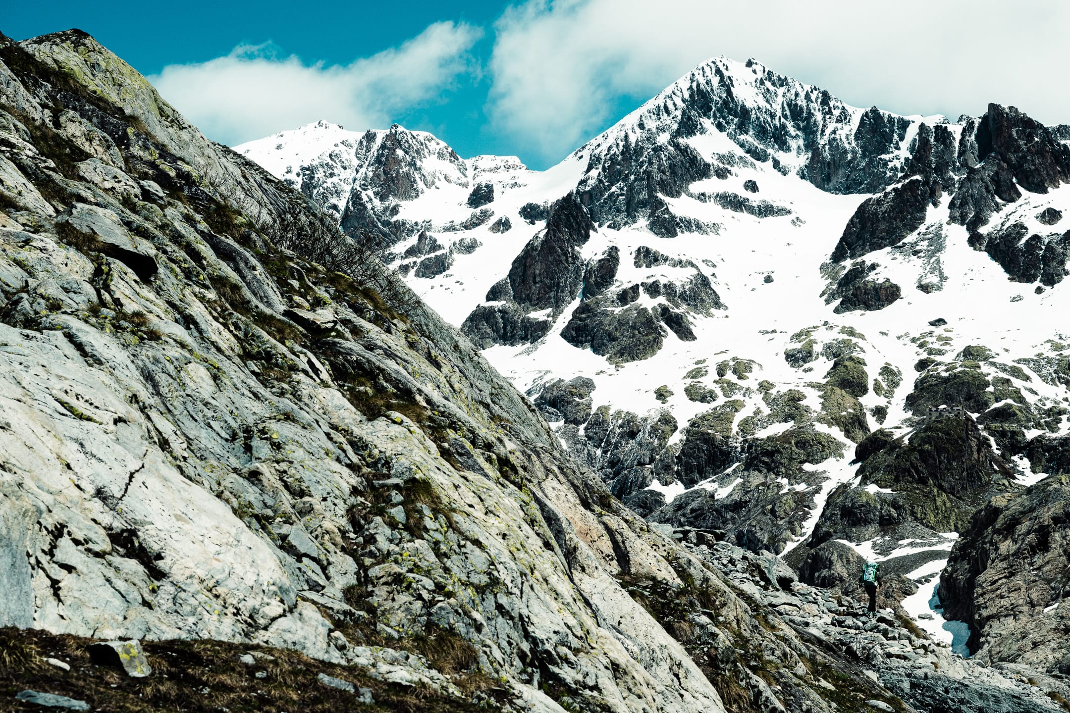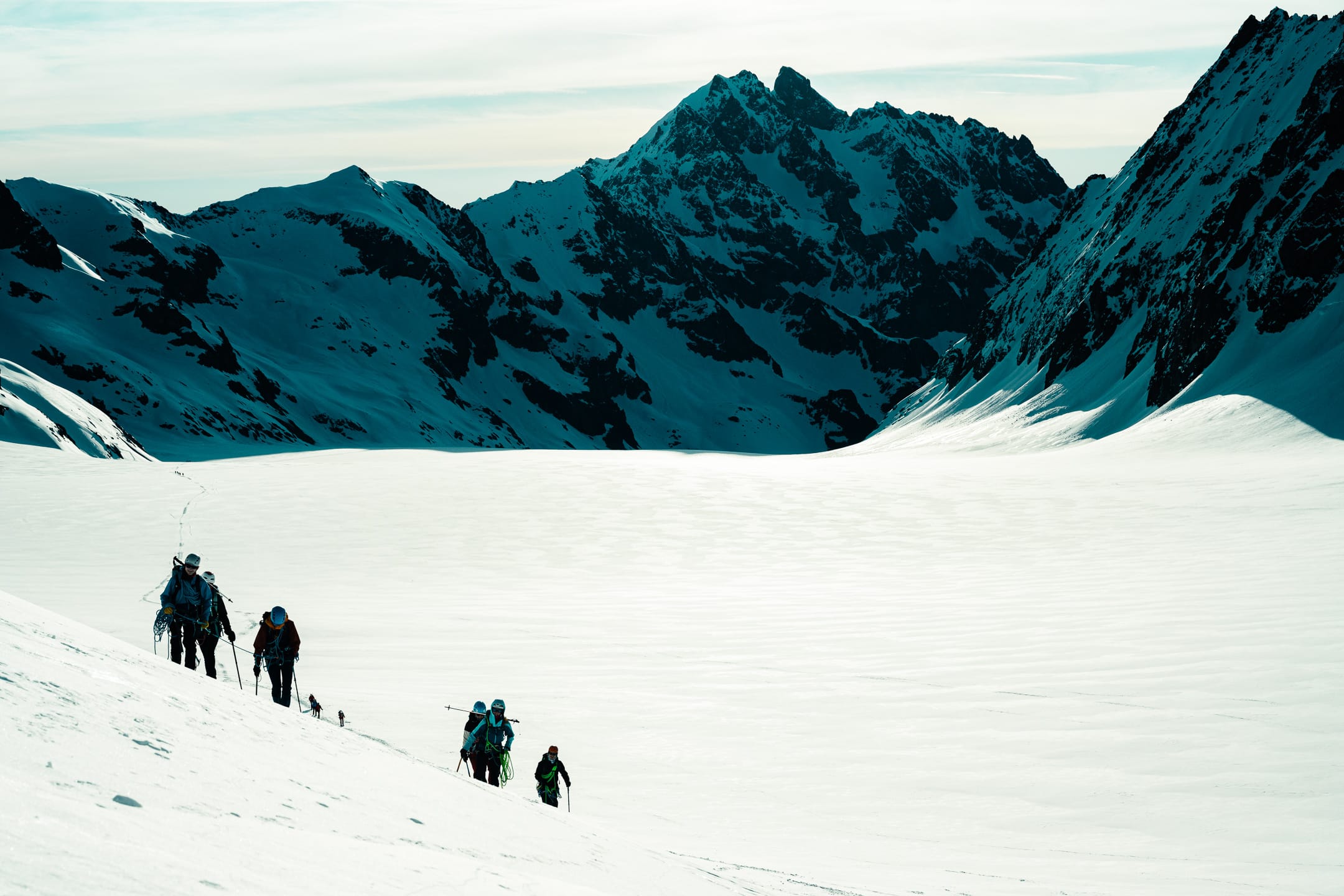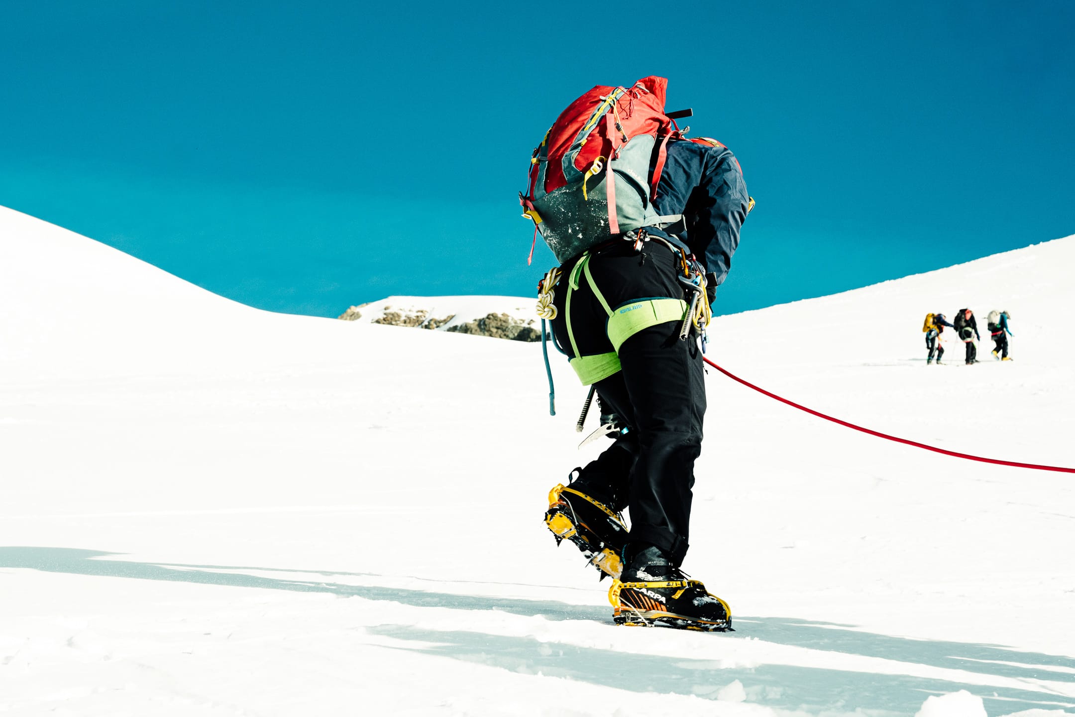 Réaliser des photos ici est un certain défi sur différents points. Niveau matériel, il faut quelque chose de léger et de réactif. J’ai mon boîtier Nikon Z7II avec un 24-70 mm f/2.8 ; trois batteries : c’est déjà lourd. Pour le ranger dans le sac d’alpinisme, j’utilise une housse. Je le laisse toutefois accroché à la bretelle du sac à dos, avec une attache rapide, afin de pouvoir faire mes prises de vue au plus vite. Malgré le peu de matériel, le dénivelé m’a rappelé l’expression de « caillou » pour discuter équipement photo. Oui, j’ai l’impression d’avoir lesté le sac. Je suis le seul avec du matériel photographique conséquent, en plus des essentiels d’alpinisme que nous avons chacun·e : je ne regrette pas de travailler le cardio pour ne pas être à la traîne.