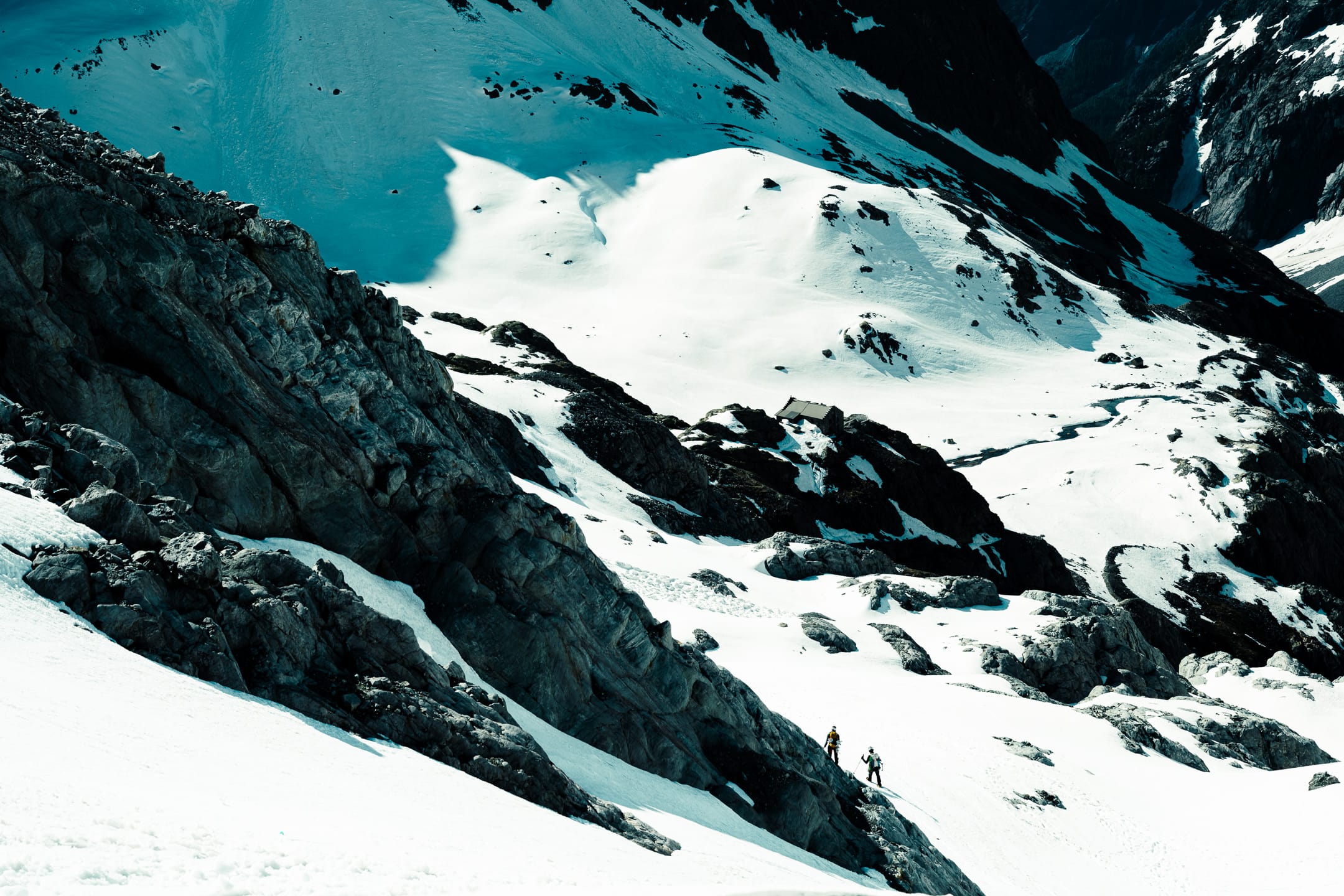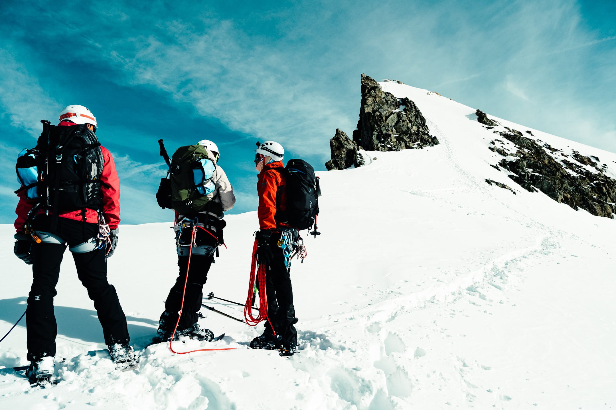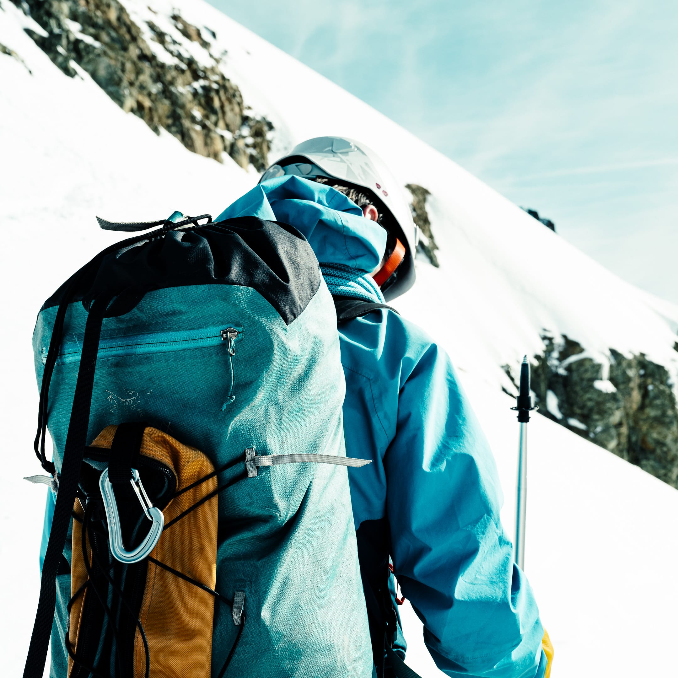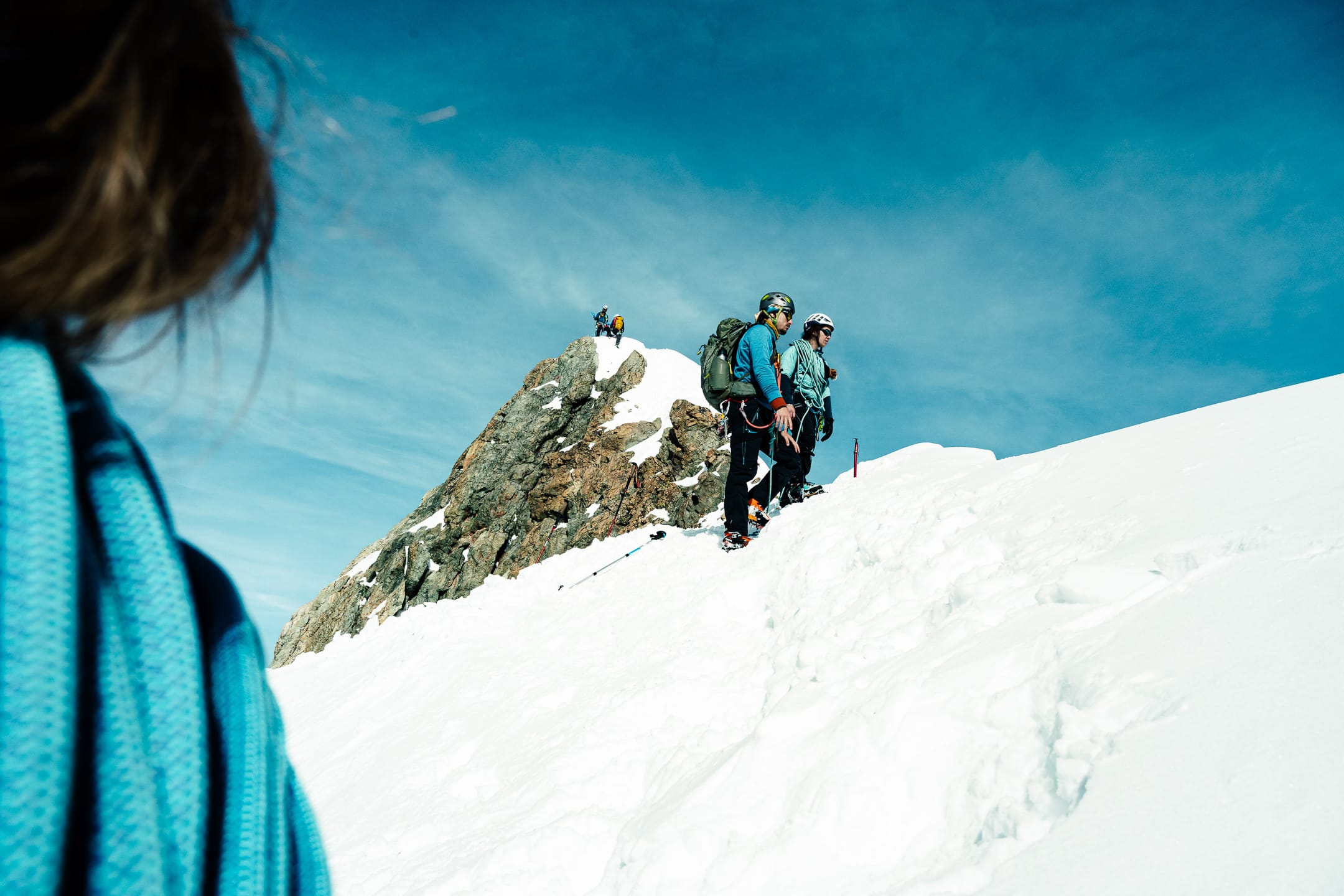 Réaliser des photos ici est un certain défi sur différents points. Niveau matériel, il faut quelque chose de léger et de réactif. J’ai mon boîtier Nikon Z7II avec un 24-70 mm f/2.8 ; trois batteries : c’est déjà lourd. Pour le ranger dans le sac d’alpinisme, j’utilise une housse. Je le laisse toutefois accroché à la bretelle du sac à dos, avec une attache rapide, afin de pouvoir faire mes prises de vue au plus vite. Malgré le peu de matériel, le dénivelé m’a rappelé l’expression de « caillou » pour discuter équipement photo. Oui, j’ai l’impression d’avoir lesté le sac. Je suis le seul avec du matériel photographique conséquent, en plus des essentiels d’alpinisme que nous avons chacun·e : je ne regrette pas de travailler le cardio pour ne pas être à la traîne.