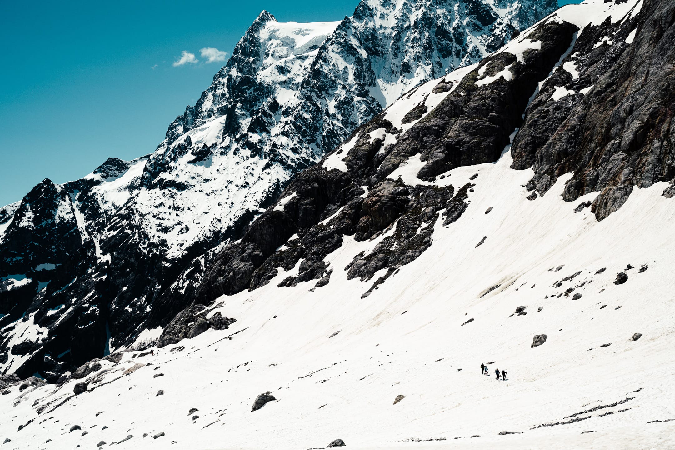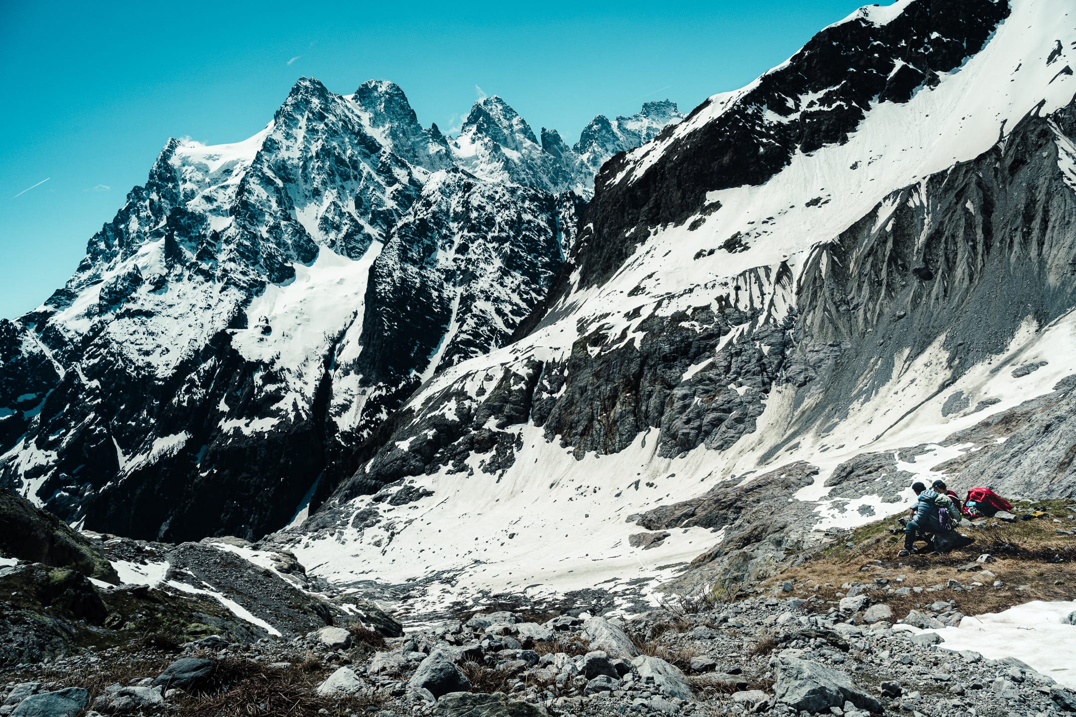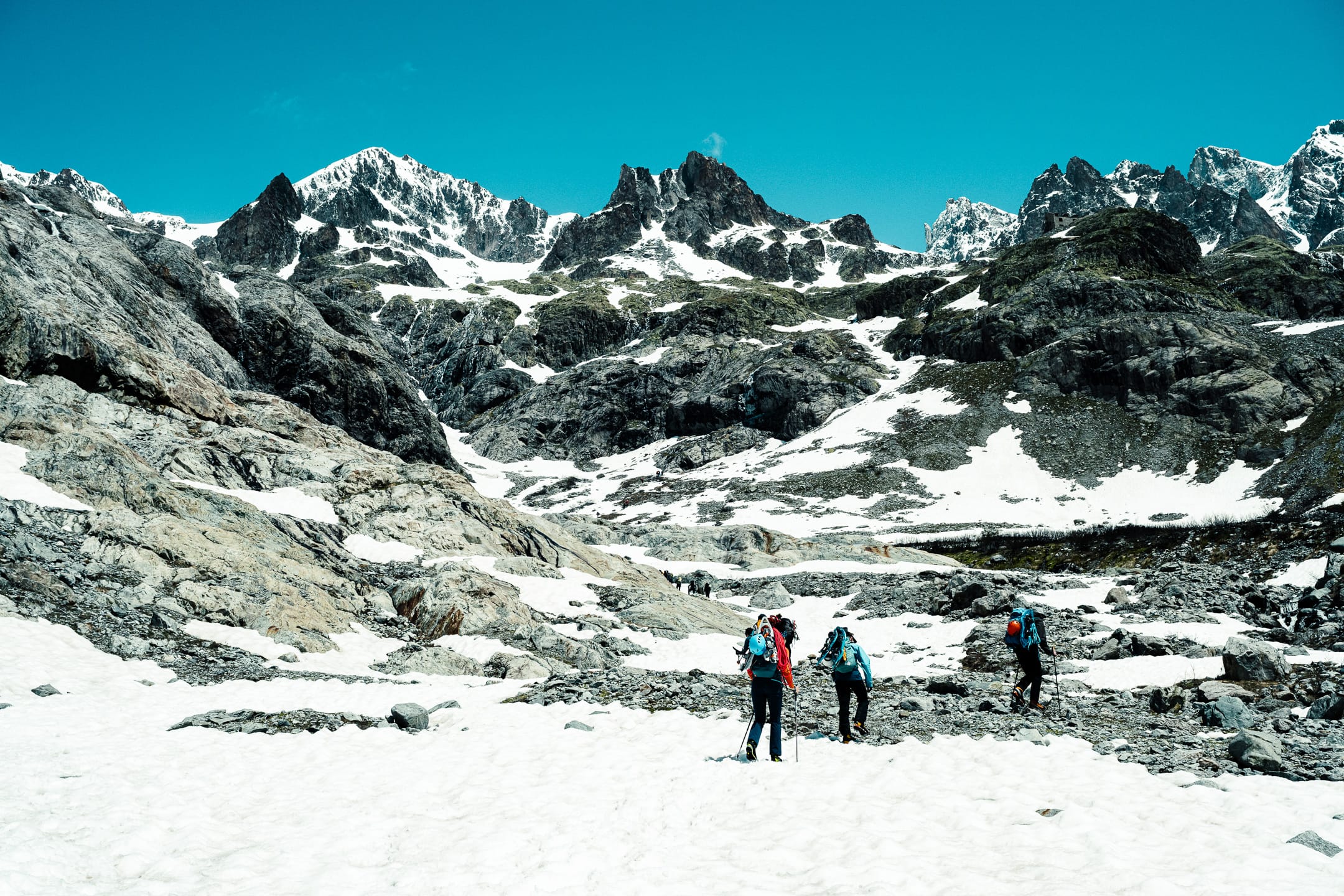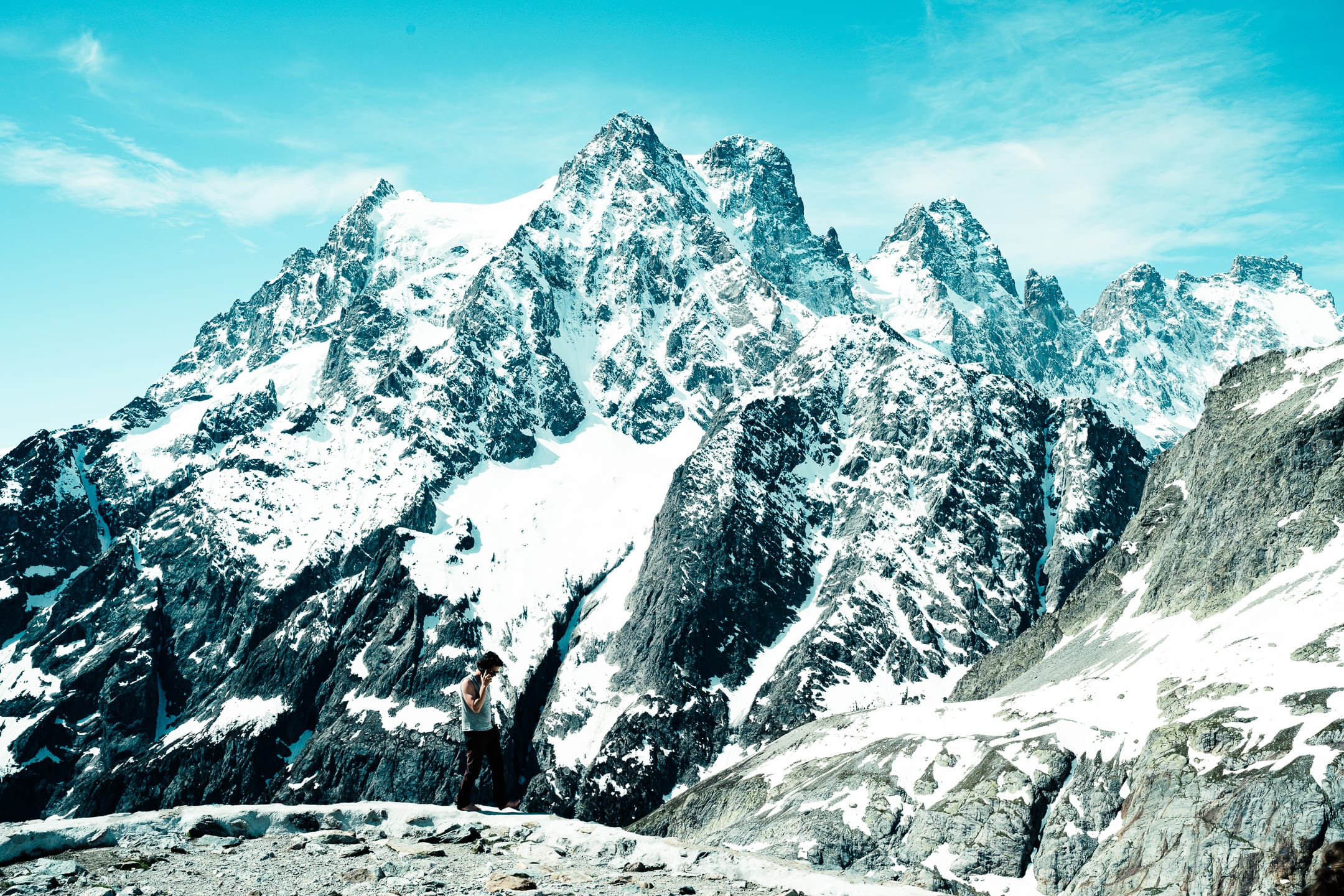 Les Écrins sont un bijou à protéger, comme d’autres chaînes montagneuses en France, puisqu’ils n’ont pas été urbanisés à outrance. Le paysage plurimillénaire façonné par les éléments naturels n’est pas défiguré par un anthropisme vorace. Les quelques installations humaines qui peuplent cette région ont l’air à leur place. J’ai eu la possibilité d’y aller plusieurs fois. Cette fois-ci, nous étions en mai. J’étais avec le Club alpin Île-de-France pour trois jours. Objectif principal : une initiation en groupe aux techniques de base de l’alpinisme et principalement à la progression sur neige et glace.