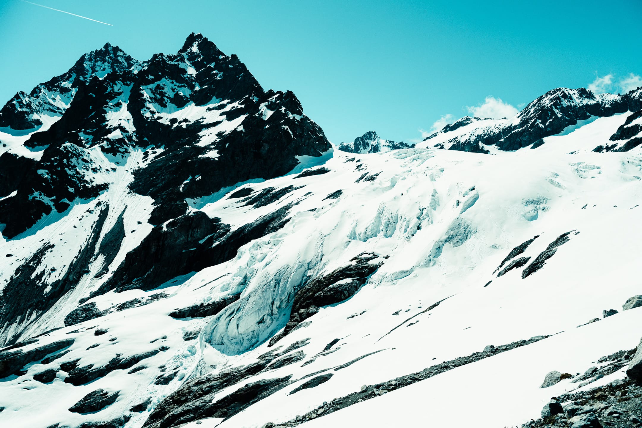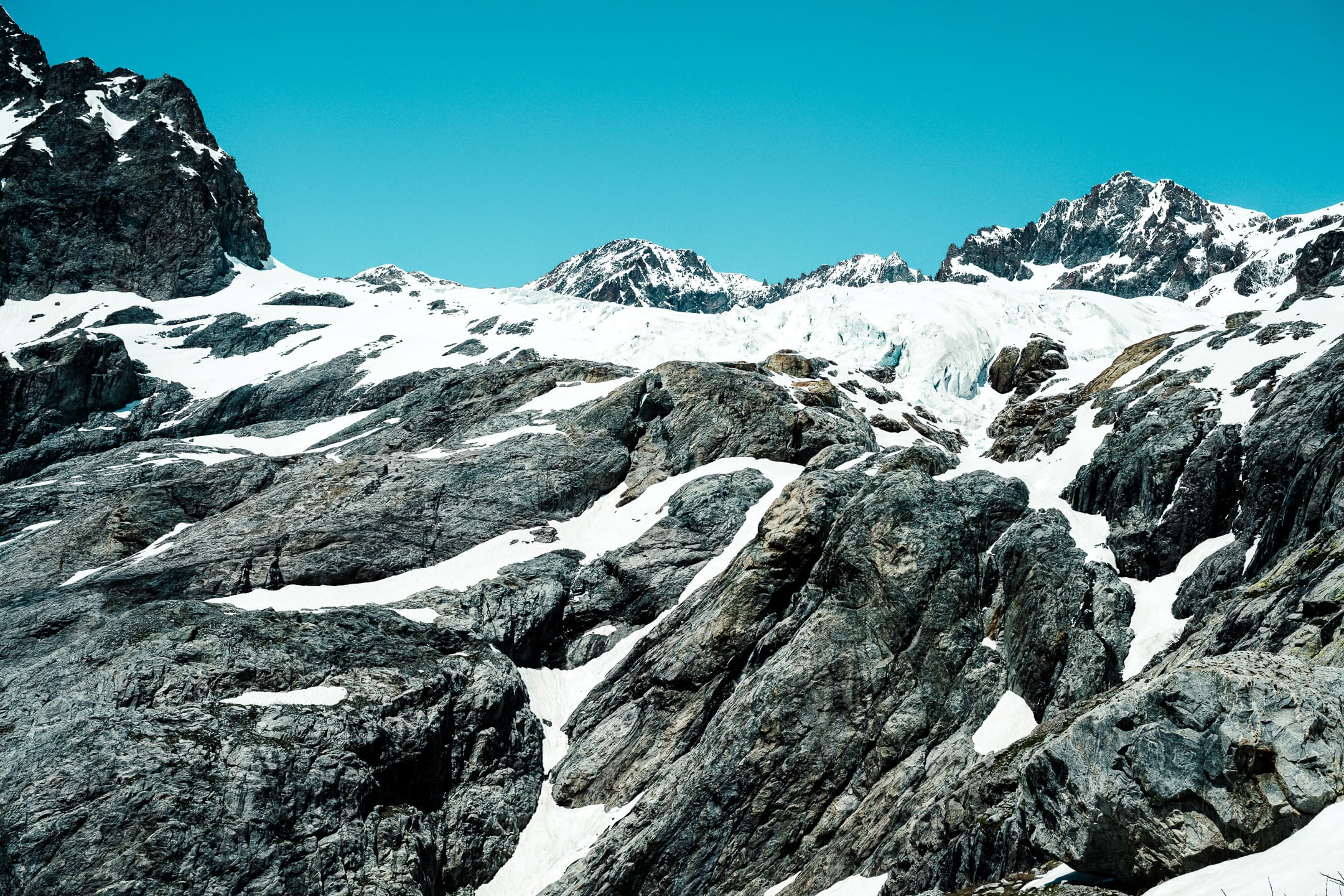 Réveil à 4 h 20, petit déjeuner à 4 h 30, puis départ pour le Pré de Madame Carle, à 1875 mètres : le parking où nous avions laissé les voitures le premier jour. On longe la rive gauche du glacier. Il est assez tôt pour se faire plaisir une dernière fois en montant au col du Glacier Blanc, à 3275 mètres. On dépose en bas une partie des affaires non essentielles, près de la moraine latérale gauche, puis on s’attaque à la montée. Quelques gouttes de sueur, un peu de pâte d’amande : nous voilà déjà en haut. Quelques photos, un au revoir à la vue environnante, puis redescente vers la vallée d’Ailefroide.