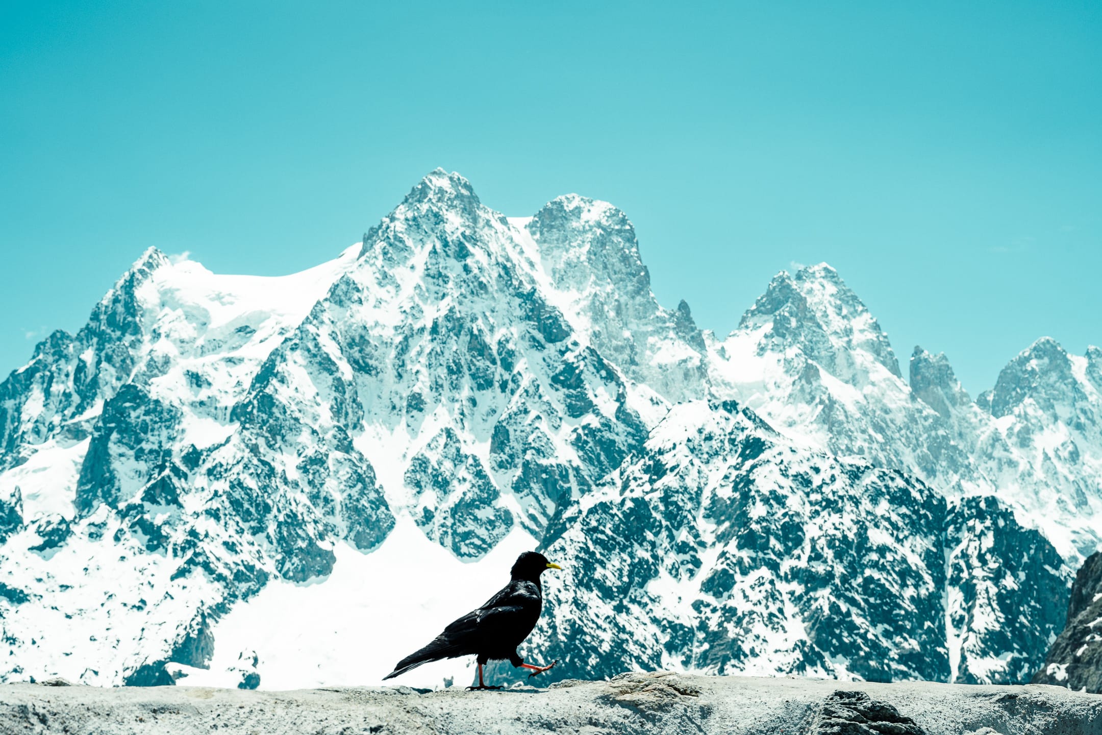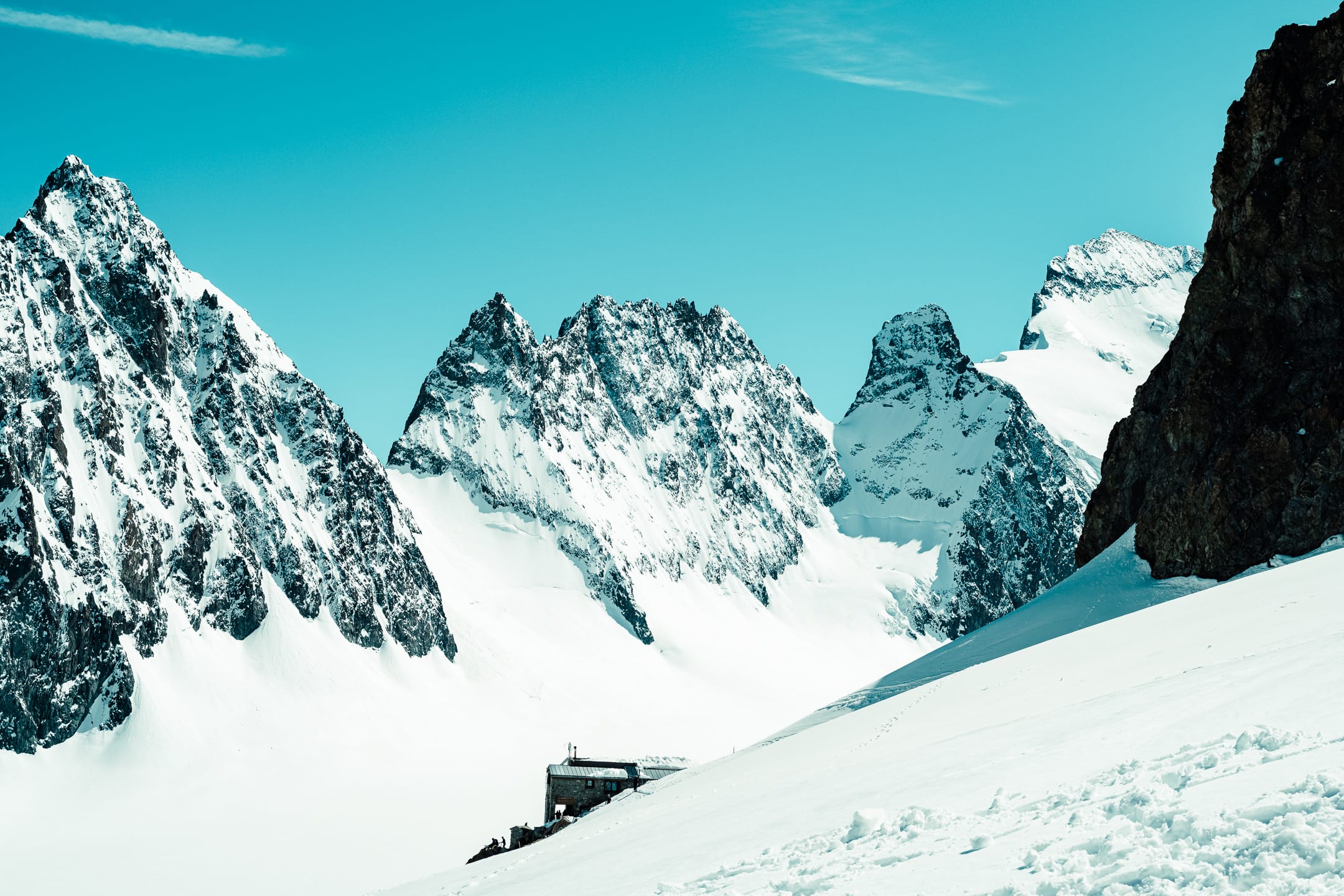 On s’arrête rapidement au refuge du Glacier Blanc pour manger. On en profite pour donner des nouvelles aux proches, déchausser les crampons, faire une rapide sieste. Les chocards profitent des courants d’air chauds pour effectuer quelques voltiges face à nous, puis nous piquer les miettes du repas. On redescend vite : beaucoup ont leur train le soir même, et il ne s’agirait pas de le louper. Quelques glissades ponctuent la descente ; au vu de la chaleur, un peu de neige ne fait pas de mal.