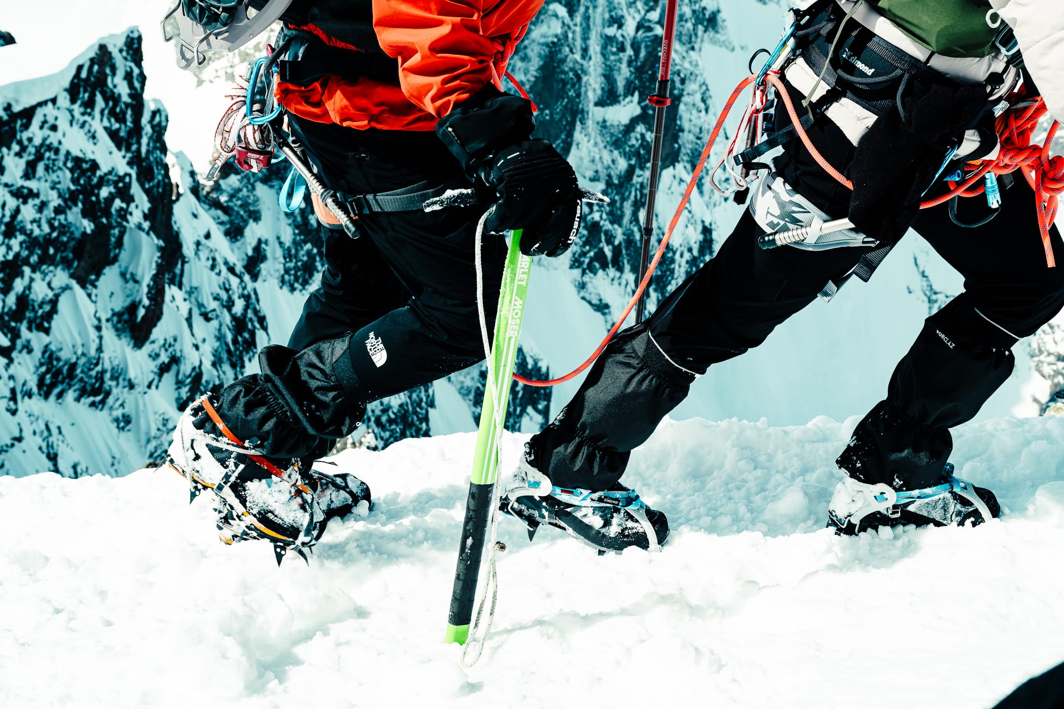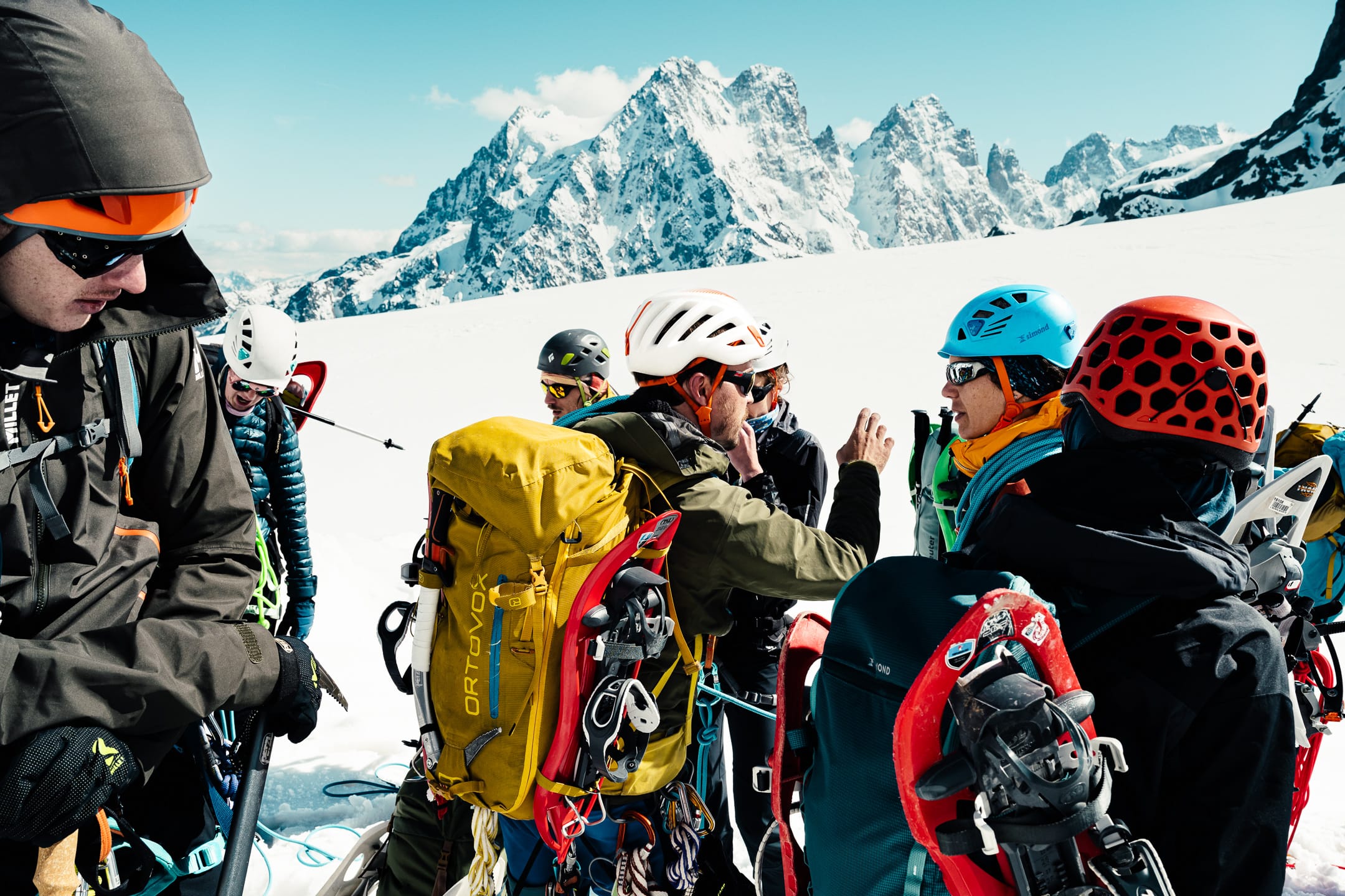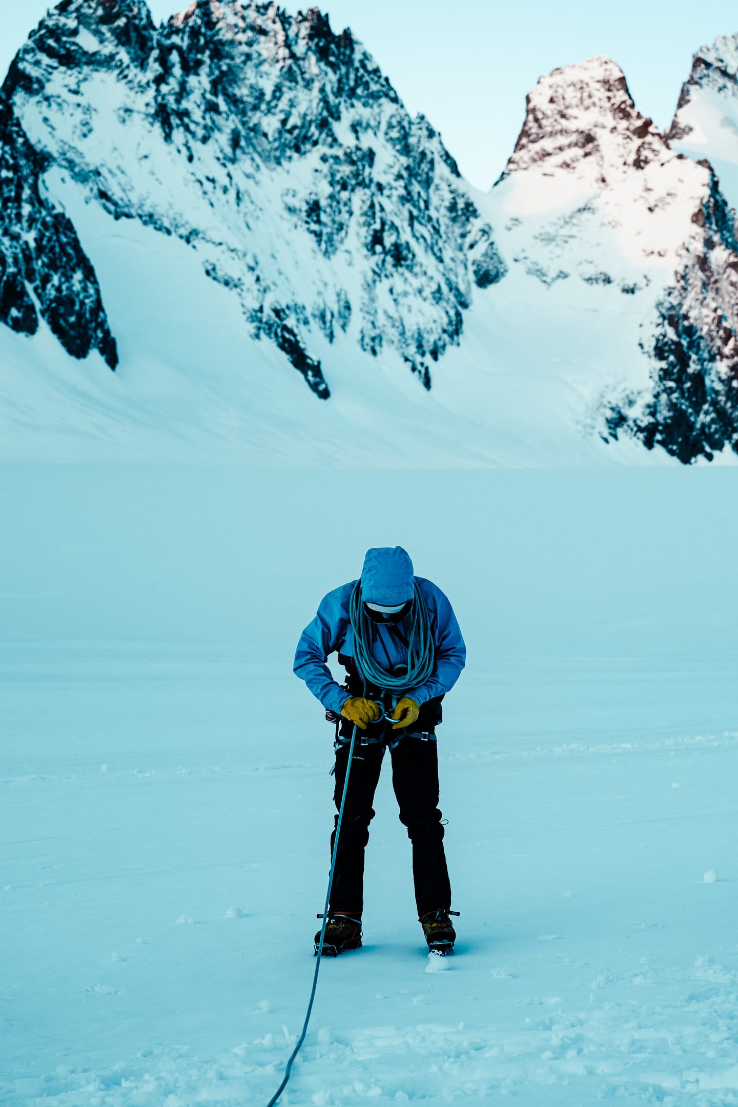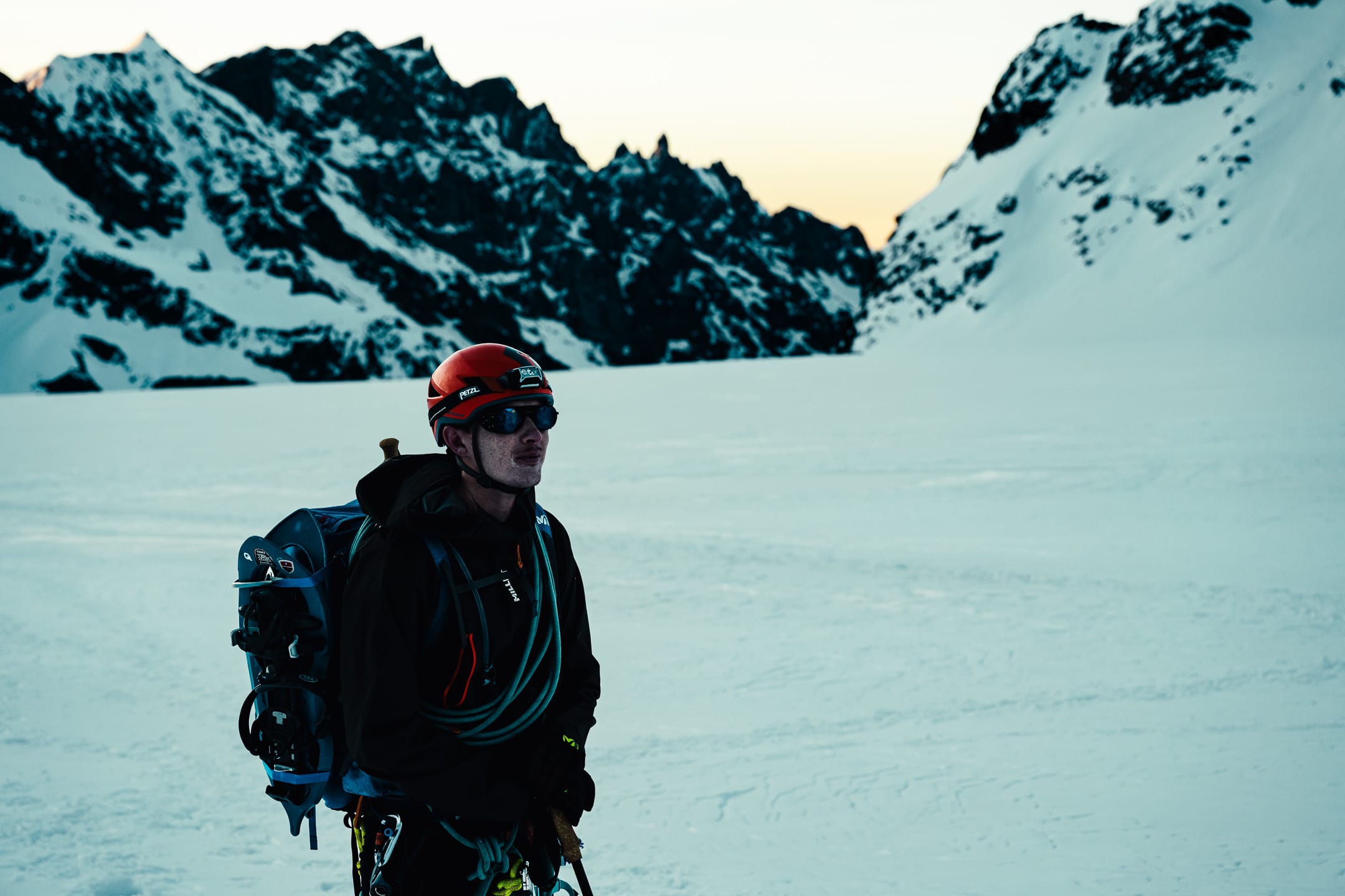 Outre le matériel photo, il faut aussi gérer le temps en permanence. D’un côté, celui nécessaire à la réalisation des clichés et à la gestion du matériel. De l’autre, celui du groupe et de la cordée, qu’il ne faut pas mettre en retard. La prise de vue demande toujours un arrêt du photographe, physique et/ou mental. C’est rapide, mais parfois peu compatible avec des activités qui exigent une concentration constante, ainsi qu’un déplacement continu dans un environnement non aseptisé et qui peut être dangereux si l’on y agit de manière inadéquate. Pour l’image, il faut parfois s’arrêter physiquement quelques secondes ou minutes : cela peut être désagréable, voire risqué, pour la cordée. Il faut aussi s’arrêter mentalement pour se concentrer, ce qui peut créer des problèmes si c’est mal géré. Ce temps de la photo peut entrer en contradiction avec celui du groupe. Pour moi, en montagne, c’est un aspect difficile à équilibrer. Ne serait-ce que le matin : lorsque tout le monde boucle son sac, j’ai besoin d’une dizaine de minutes de rab pour vérifier la carte mémoire, la batterie (vis-à-vis du froid) et la lentille frontale, souvent entachée par la neige en suspension.