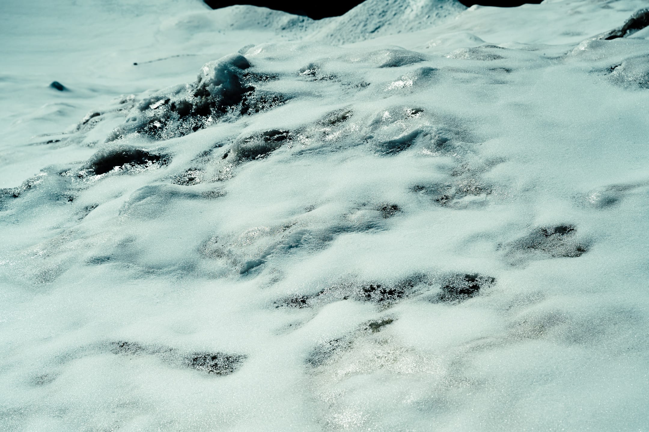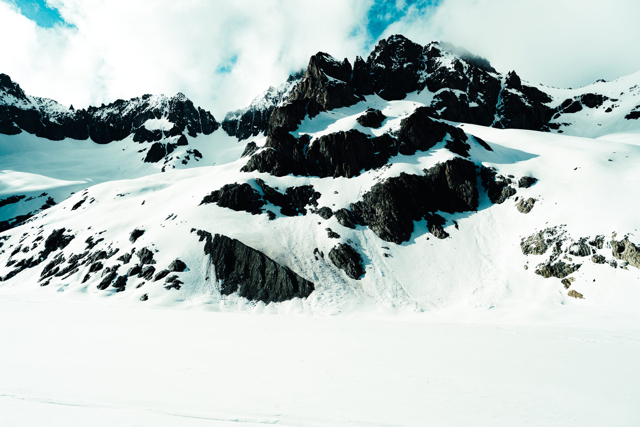 Départ avant le lever du soleil de Grenoble, on dépose la voiture au Pré de Madame Carles au bout de la vallée d’Ailefroide. Première étape : monter au refuge du Glacier Blanc pour y faire une pause casse-croûte. Avant même le refuge, la neige est déjà bien présente. Les jours précédents, il a dû neiger plus de 20 à 30 cm selon les lieux et leurs reliefs. On franchit ces quelques obstacles, on monte et glisse dans une neige molle, pas encore de la soupe, ce n’est pas désagréable. Le soleil est au rendez-vous, malgré des températures parfois assez fraîches lorsqu’il se cache la nuit ; lui et ses rayons chauds ne nous quitteront pas du séjour.
