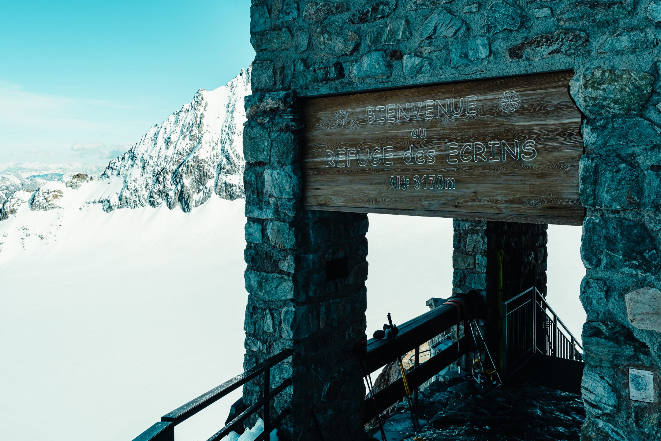 Les participants les plus lourds déchaussent bien vite les crampons au profit des raquettes. On continue comme ça d’avancer sur le Glacier Blanc jusqu’à atteindre la moraine latérale gauche surplombée par le refuge des Écrins à 3170 m d’altitude. Le dernier raidillon pour l’atteindre épuise nos dernières forces. On arrive pile à temps pour le repas du soir, 19 h. Rapide repas, débrief, plusieurs personnes souffrent un peu de la fatigue et de la montée en altitude soudaine. On termine les sacs pour le lendemain et on constitue les cordées. Je profite des dernières minutes avant le coucher pour prendre quelques photos, puis direction le dortoir qui passe de 10 °C à 25 °C en 15 minutes ; à deux douzaines de dormeurs·ses, la nuit fut courte.