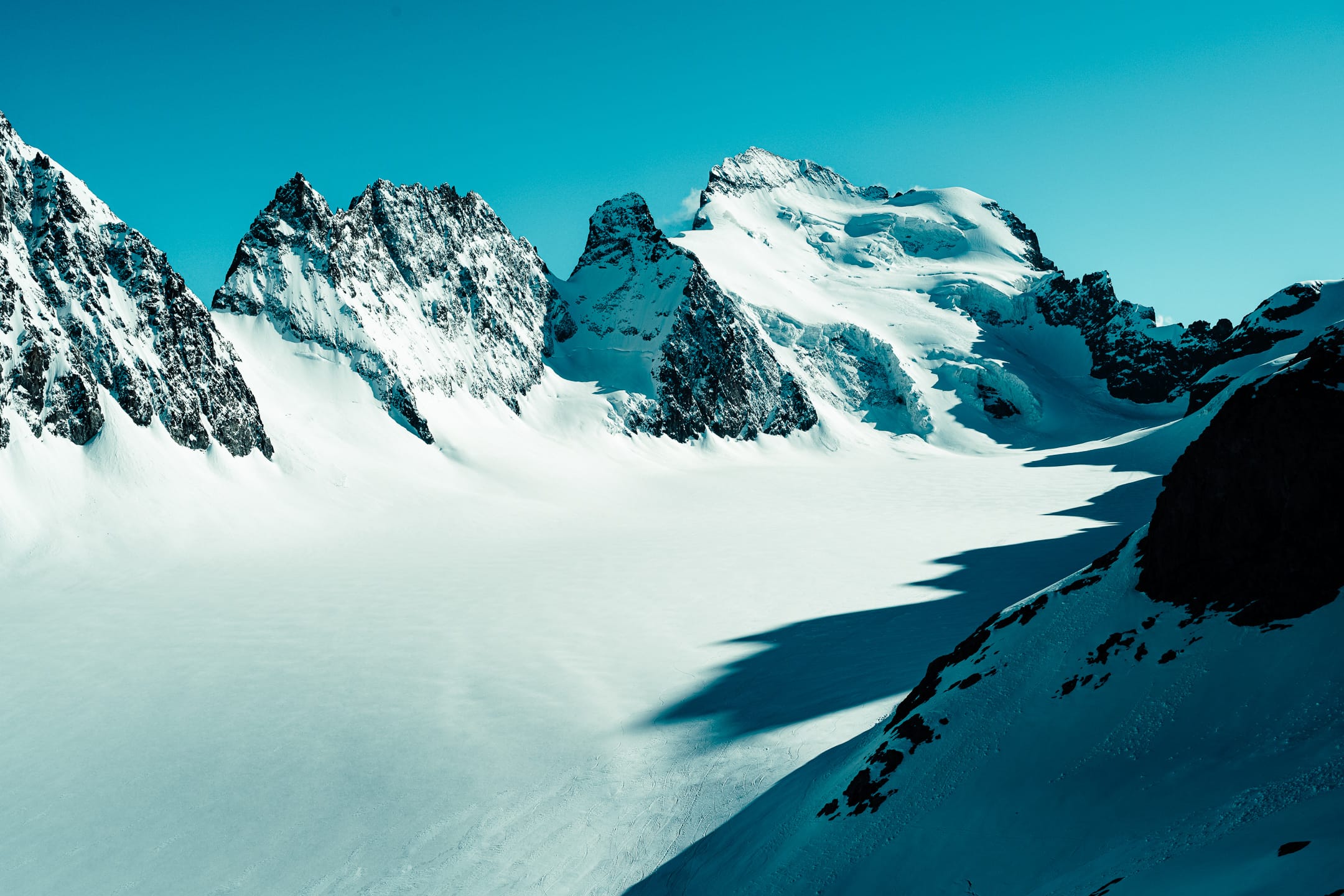 On grignote rapidement au refuge, surplombé par le majestueux Glacier Blanc qui tire bien son nom. Puis on chausse les crampons, on enfile le casque et le baudrier, on attache le matériel au porte-matériel. Quelques remarques de sécurité, et c’est parti. Première étape : grimper la moraine frontale pour accéder au glacier. Arrivés juste avant le front de ce dernier, on s’encorde. On avance dans cet univers blanc, noir et bleu : un triptyque de couleurs magnifiques. Très vite, la neige fraîche rend la progression difficile. Déjà fatigués par un réveil aux aurores et la première montée sous la chaleur, la suite s’annonce longue. Heureusement, les référents·es cafistes ont bien géré le coup et ont loué des raquettes en urgence sur la route depuis Grenoble. Il nous reste peu de temps pour atteindre le refuge avant la nuit.
